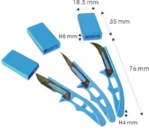 Blue plastic scalpel handle with protective sheath. This unique design fits in your pocket. Remove the sheath cover and slip it over the handle for a solid grip. The extremely sharp, non-sterile blade is made in the United Kingdom. Ideal for castration and other procedures. 3 sizes available, packed 40 per box