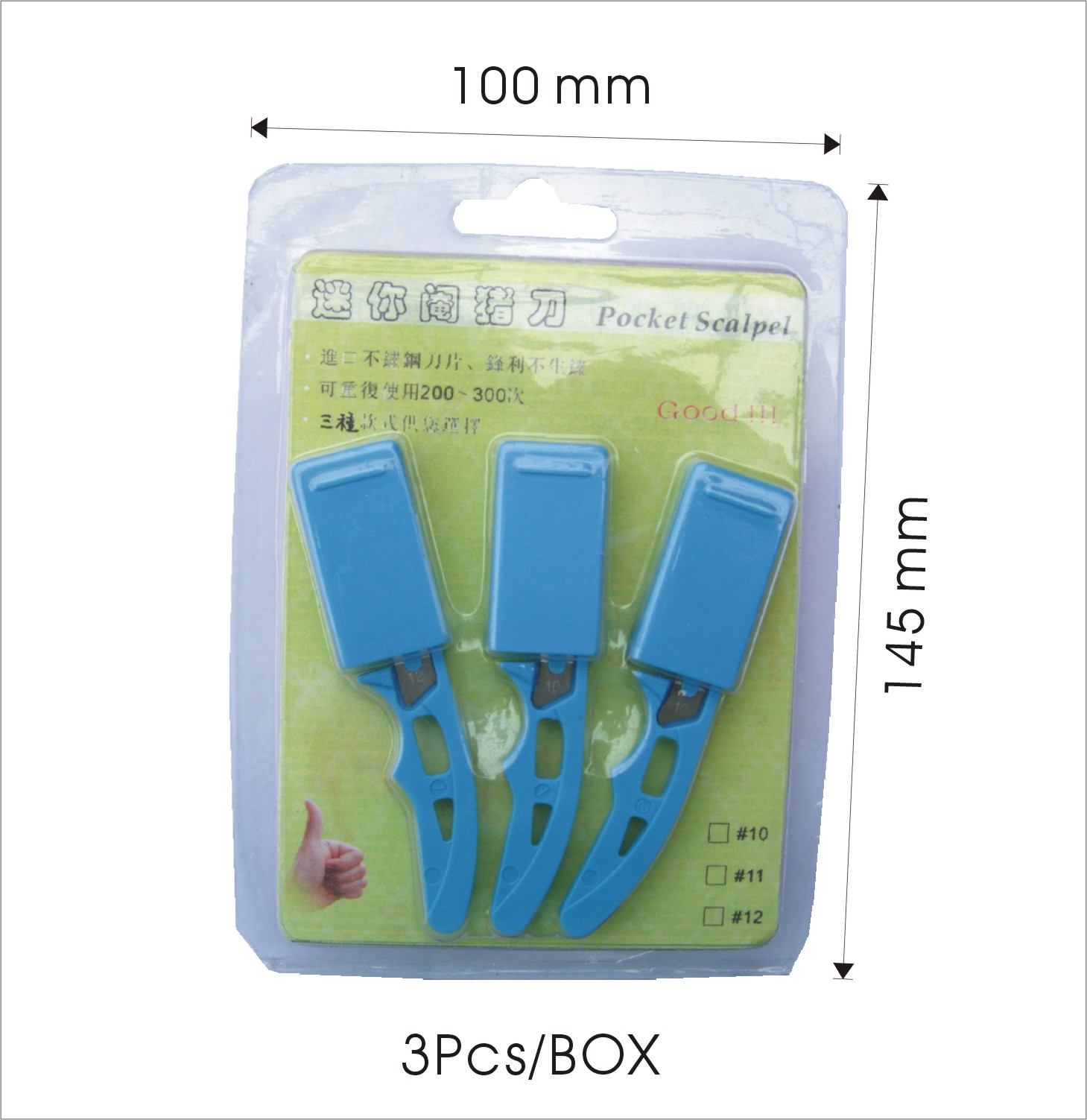 迷你藍色刀把設計,隨身攜帶輕巧方便,消毒后隨時使用,進口不銹鋼刀絕對鋒利無比,正常使用下每把刀可閹割小豬約200~300頭,遇碘酒不起反應不發(fā)黑,不生銹。
